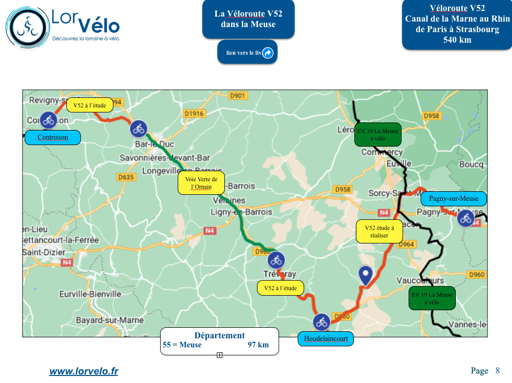 Lien vers le site de cyclotouristes LorVélo : Les étapes de la V 52 à travers les 8 départements de Paris à Strasbourg