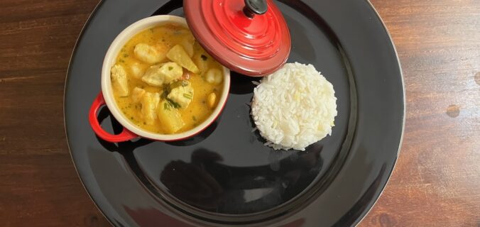 Préparer un bouillon avec le bouillon de poule + le lait de coco + la crème + poivre.