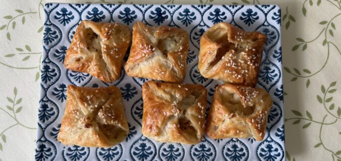 Badigeonner avec le jaune d’œuf battu avec une cuillère d’eau. Saupoudrer du sésame et enfourner à 180° pour 25 mn. A surveiller. A la sortie du four, badigeonner les feuilletés, avec un peu d’huile d’olive à l’aide d’un pinceau.